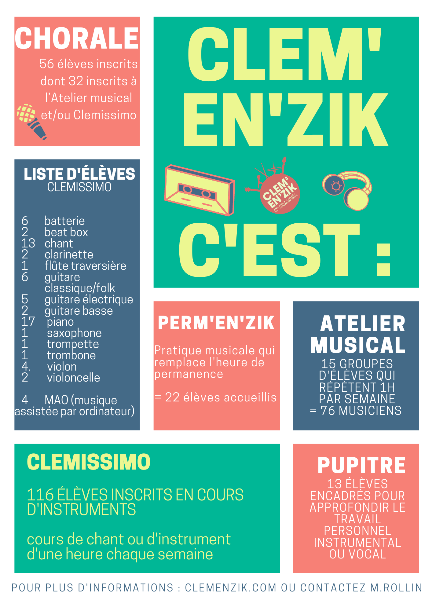 Clem’en’Zik est un projet associatif de développement et de démocratisation de la pratique musicale au collège Clemenceau (Lyon 7e) porté par M. Vincent Rollin, professeur agrégé d’éducation musicale et chant choral, dans le cadre de l’association d’intérêt général Tous à la musique